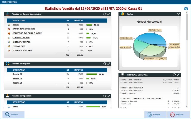 Tramite il sistema di statistiche è possibile visualizzare in tempo reale l’andamento delle casse, visualizzare il venduto generale o per operatore, controllare l’incassato ecc.