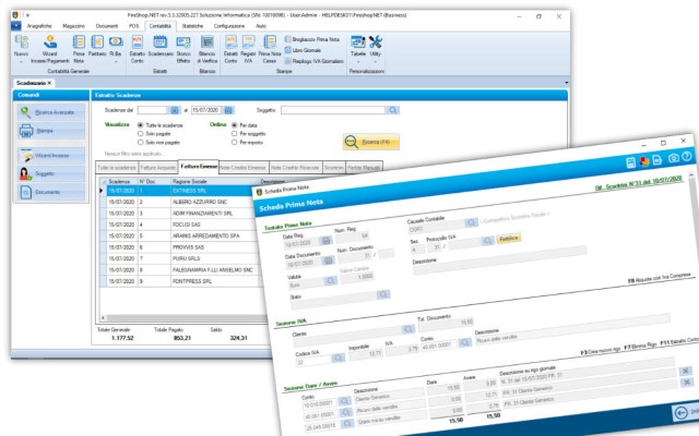 È possibile tenere traccia delle scadenze clienti e fornitori, degli incassi e dei pagamenti, l'emissione delle Ri.Ba e tanto altro.